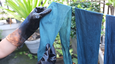 It is green in colour once the cloth is removed from the vat, by the time when it comes into contact with the oxygen the cloth develops into a rich blue shade of colour. To achieve darker shades of blue, the cloth is dipped repeatedly into the indigo vat, in between each successive immersion drying thoroughly.