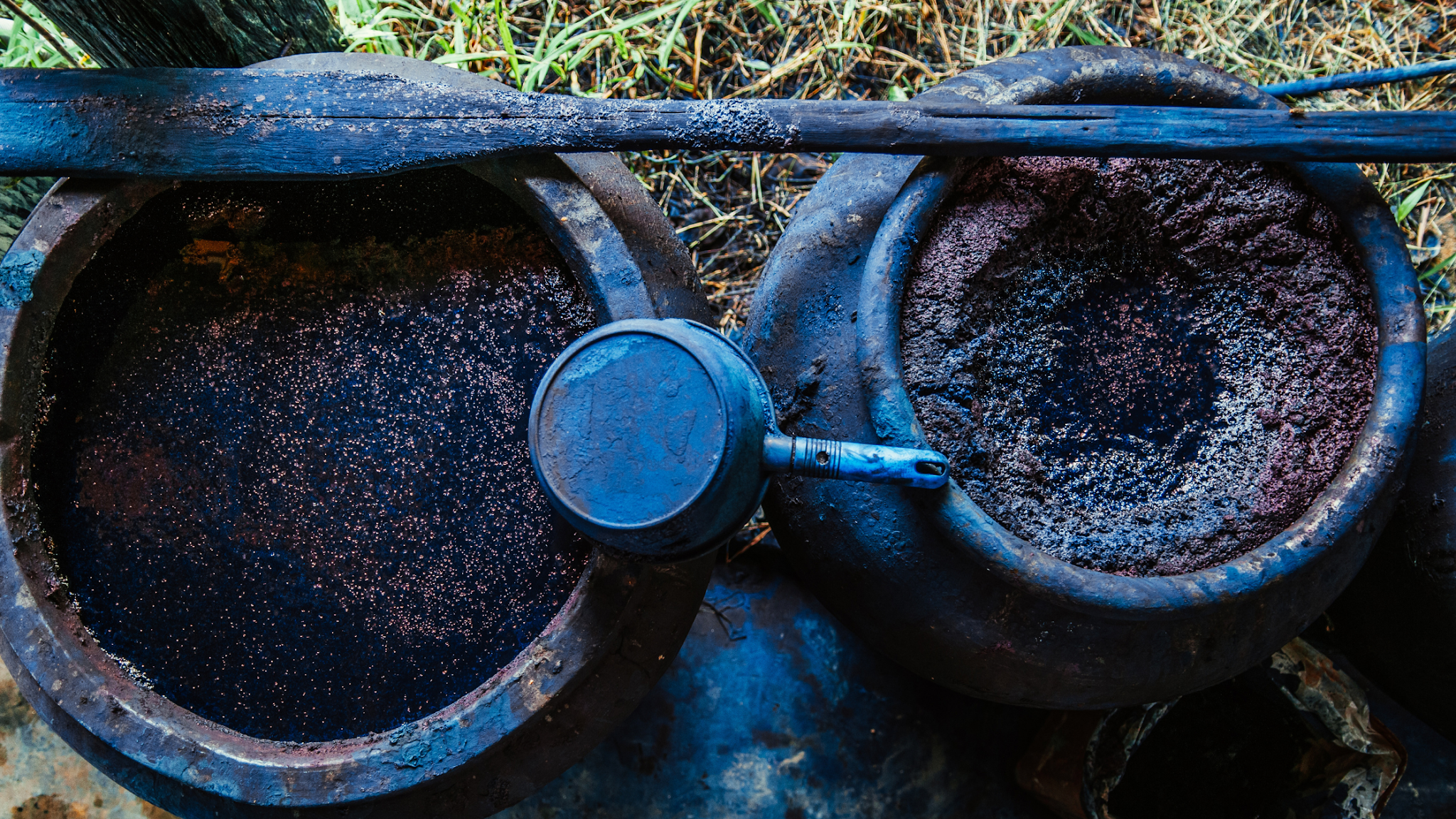 In the deep vat of Indigo dye, the dabu printed cloth is next immersed. The natural indigo which is derived from the Indigo plant Indigofera tinctorial is not water-soluble. The natural indigo is purchased in blocks, ground into a powder, and before fermenting it is soaked in an underground vat containing water and a strong alkaline lime powder. To make the colour chemically available to bond to the cloth, the strong alkaline reduces the indigo dye and remove oxygen from the liquid.